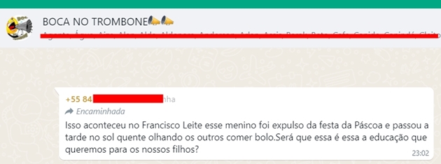 Está circulando em vários de grupos de whatsapp da cidade de João Câmara a foto de uma criança sentada pelo lado de fora da escola municipal Francisco Leite, segundo informações a criança foi proibida de participar da festinha que estava acontecendo na escola.