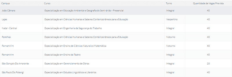 Ao todo, são 305 vagas distribuídas entre os campi João Câmara, Lajes, Natal-Central, Parelhas, Parnamirim, São Gonçalo do Amarante e São Paulo do Potengi.