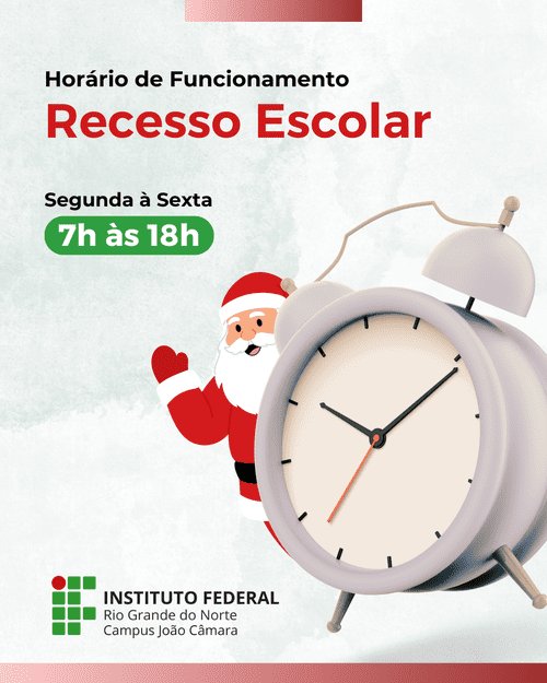A Direção-Geral do Campus João Câmara do IFRN, por meio da Portaria Nº 403/2025-DG/JC/RE/IFRN, informa à comunidade acadêmica que, durante o período de recesso escolar e férias docentes, compreendido entre 24 de dezembro de 2025 e 16 de janeiro de 2026, o horário de funcionamento desta unidade de ensino será das 07h às 18h, de segunda à sexta-feira.
