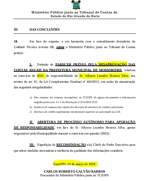 As contas de 2022 da Prefeitura de Mossoró, sob a gestão do prefeito Allyson Bezerra, receberam parecer prévio pela desaprovação por parte do Ministério Público junto ao Tribunal de Contas do Estado do Rio Grande do Norte. A manifestação segue o entendimento técnico da Corte e amplia a pressão sobre o gestor, que já enfrenta recomendação semelhante referente ao exercício de 2023.